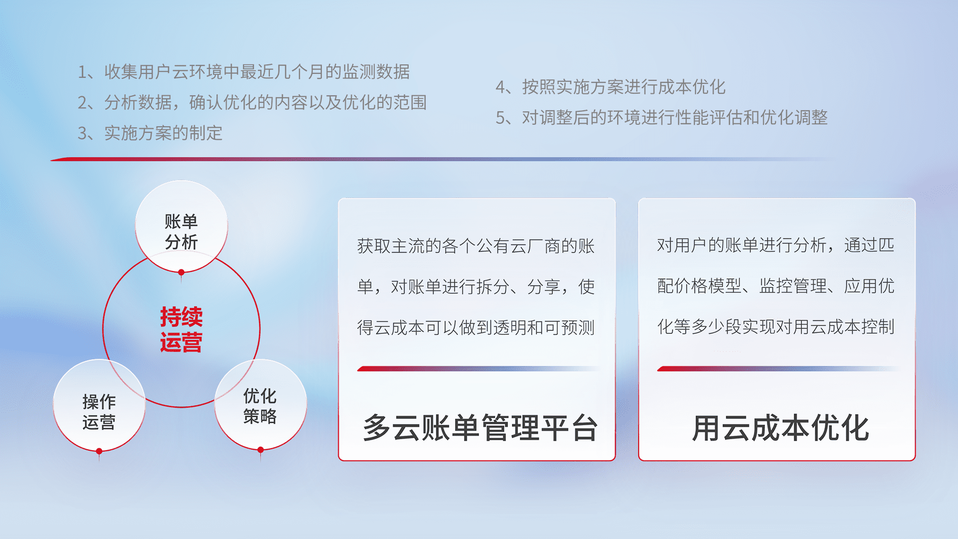 通过多云纳管,,以统一的资源数据模型把客户的云资源进行抽象和封装,,进而实现对多云资源的统一操作,,,保障云资源管理的可靠性、、、、稳定性与可用性。。量身定制化运维内容,,,,配置、、、、开发运维、、补丁管理、、备份、、、监控、、、认证和访问管理、、、、审计和日常巡检等,,,,保障在用云过程中的可靠度,,,,稳定度以及高可用率。。