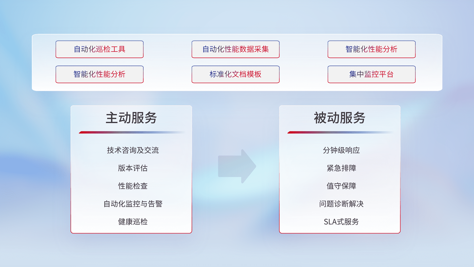 智能化工具和标准化文档,,保障服务质量,,,提供主动服务(包含技术咨询、、版本评估、、性能检查、、自动化监控与告警、、健康巡检)和被动服务包含(分钟级响应、、紧急排障、、、值守保障、、、、问题诊断解决、、、SLA服务)。。。。